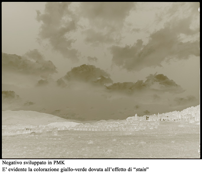 Un negativo correttamente esposto, presenta dopo lo sviluppo in PMK, una scala tonale molto estesa con le densità maggiori trasparenti e pienamente separate. La colorazione giallo-verde può manifestarsi in maniera più o meno pronunciata. Naturalmente cercheremo di trarre vantaggio dagli effetti di questo sviluppo cercando di ottenere una quantità di “stain” più alta possibile.