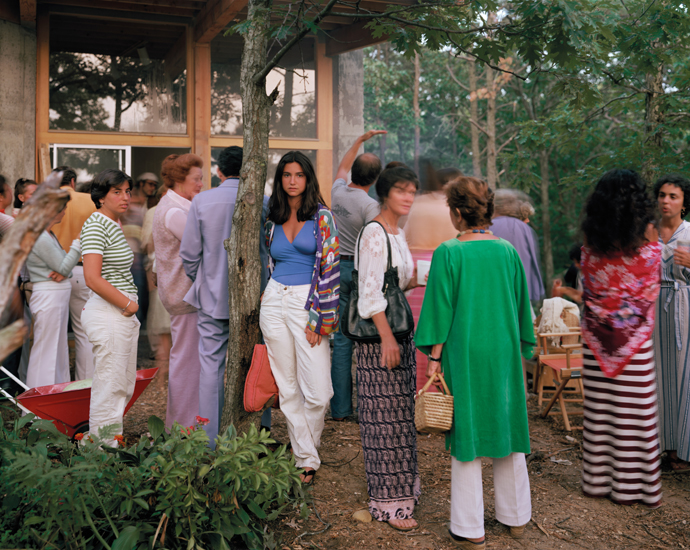 “I carried the view camera everywhere I went, from supermarkets to the beach to a cocktail party. In the kids of this crowd, a young woman stood out – a wood nymph – lost in her thoughts, out of her elements, with the adults droning on around her. I whispered this command across the space to her, – Stay as you are – . She did and, in the photograph, always will”.